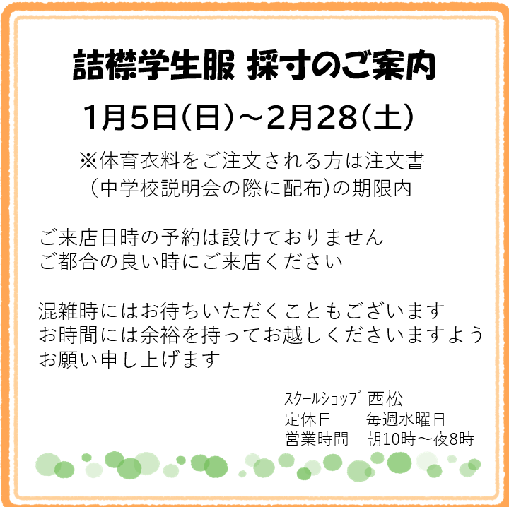 詰襟学生服採寸ご案内 Posted on 11/24/202511/24/2025 by nishimatu 所要時間目安 制服のみ 約30分 体育衣料あり 約1時間 個人差ございます 年明けの1月より採寸を行います。 皆様のご来店心よりお待ちしております😊